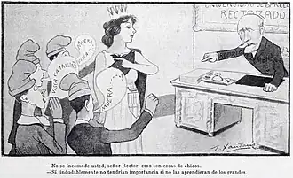 Rodríguez was radically opposed to the Catalanization of the university to the point that, while he was the rector of the UB, he refused to cede the paranymph so that the First Catalan University Congress could be held.[2] In 1903, he refused to admit the use of Catalan at the university when asked by the Association of Catalan University Studies in 1905.[2] At the end of his life, however, he greatly attenuated this initial anti-Catalan attitude.[2] In 1913, he not only became a member of the First Congress of Catalan-Language Doctors but, in 1917, published the communications delivered to him in Catalan in his journal.[2]