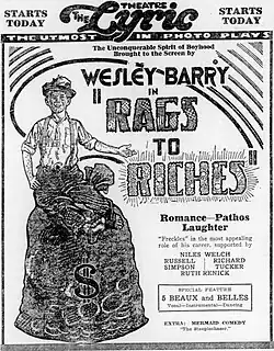 Rags to Riches is a 1922 American silent comedy film directed by Wallace Worsley and written by Walter DeLeon and William Nigh. The film stars Wesley Barry, Niles Welch, Ruth Renick, Russell Simpson, Minna Redman, and Richard Tucker. The film was released by Warner Bros. on September 24, 1922.[2][3][4]
