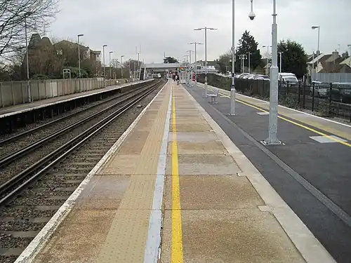 There are accessible entrances[3] without stairs on both platforms, with step-free access via Platform 1 for services towards London (via main station entrance). Step-free access via Platform 2 for services away from London (via side entrance, short ramp from Granary Close). To interchange platforms, people needing accessible access must use the road and steep paths in excess of 250 metres. (There is also a steep staircase overpass over the tracks to interchange platforms.)