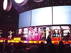 "Raining Men" was included on the set list of the Loud Tour in 2011.[30] The performance featured Rihanna in a camouflage inspired outfit, and was accompanied by dancers in the same attire who held pink rifles.[30] The set included a pink tank which was also present on the Rated R supported tour, Last Girl on Earth Tour (2010/11).[30] It began with Rihanna appearing on stage sitting on the pink tank as it was wheeled from the back of the stage to the front while Minaj's rap verse played; Rihanna then concluded the song with her vocals.[30] "Raining Men" was preceded by "Hard" and "Breakin' Dishes", and featured the singer wearing the same outfit and set design.[30] Minaj has also performed her verse on her Pink Friday: Reloaded Tour.