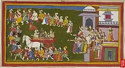 The party then decides to attend King Janaka's sacrifice in the kingdom of Mithilā, who has a bow that no one has been able to string. Janaka recounts the history of the famed bow, and informs them that whoever strings the bow will win the hand of his daughter Sītā, whom he found in the earth while plowing a field. Rāma then proceeds to not only string the bow, but breaks it in the process. Rāma marries Sītā; the wedding is celebrated with great festivity in Mithilā and the marriage party returns to Ayodhyā.[30]