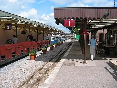 When the new company took over in 1960, the waiting shelter was converted into a cafe for visitors. In 1966 the footbridge from Coniston was installed just before the turntable. The 1930s layout lasted until 1967 when the present two platform layout was adopted. The lever frame from Birgham signal box was installed in a box opposite the workshops and general manager's office (the 1927 bungalow) in 1968/9. In 1972, awnings were erected over platforms 2 and 3, recovered from Millom station. In 1978 a two storey toilet and office building was built next to the old waiting shelter on platform 1.[1] Shortly afterwards, a second canopy was erected over platform 1, using fittings recovered from Whitehaven Station. A new ticket office and shop was built in 1983 next to the car park. The 1920s waiting shelter lasted until 2011, when it was replaced by a 2-storey cafe similar in style to the building built at Dalegarth in 2005.