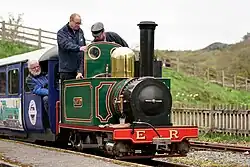 A 0-4-0T built by Sir Arthur Heywood in 1896 for the Duke of Westminster's Eaton Hall Railway. It came to Ravenglass in 1916 and left in 1919. Few photographs survive of it working in Cumbria, however the remains of the locomotive returned to the railway in 1982 after spells at Llewellyn's Miniature Railway, Southport and the Fairbourne Railway, Wales. In 1992, the R&ER Heritage Group formed, with an aim to restore the locomotive to original condition. After many years of fundraising and work, Katie’s rebuild was completed in 2017 by Station Road Steam, in Metheringham near Lincoln. She is usually on display in the railway’s museum at Ravenglass, but is frequently steamed for special events and 'driver for a fiver' days in the summer. She has also made several visits away from Ravenglass since her return to steam, including the Beamish Open Air Museum, the Fairbourne Railway, the Kirklees Light Railway, Romney, Hythe and Dymchurch Railway, Perrygrove Railway and Heatherslaw Light Railway.[1][3]