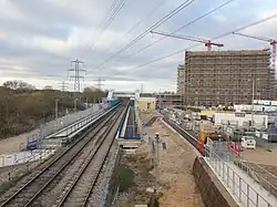 Station being constructed in March 2022, looking north from Kirtons Farm Road bridge.