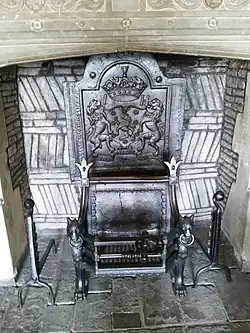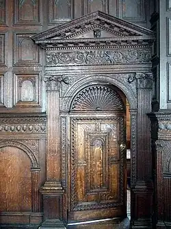 The Great Oak Room retains its original oak panelling, moulded plaster ceiling and 'double-decker' fireplace,[26] making it "one of the finest rooms in the West Country".[27] Entrance is via an oak internal porch, similar to that of Montacute House.[15] Carved above the entrance of the porch are the arms of Young (Yonge) impaling Wadham. The only features which have changed since the room was built are the enlarged Georgian windows, giving a view onto the knot garden.[28]