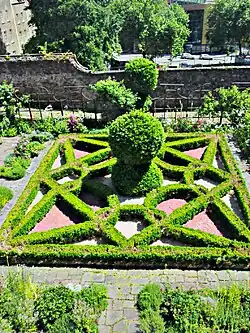 The Garden viewed from the Parlour and Great Oak Room is a 1980s interpretation of an Elizabethan Knot Garden.[46] The box hedge 'knot' is copied from the design incorporated into the ceiling of the Bedroom. Herbs and flowers are mixed together in beds as was the fashion in the 1630s, and all the plants used would have been common in a similar garden of the period.[47] The trellis is copied from a French seventeenth century design.[48]