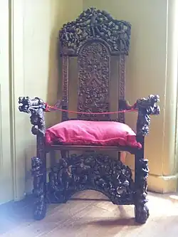 The Skinner Chair in the Parlour was carved for Bishop Robert Skinner in the late 17th century.[44] The story told in the relief is that of Actaeon the Hunter who angered Artemis and was punished by being turned into a deer and attacked by his own hunting party.