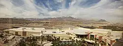 The resort opened with 415 hotel rooms, approximately half of its final room count. The remaining rooms, part of an expansion to the hotel tower, were expected to be open by December 2006.[66][68] The Red Rock Resort was only the second casino to open in Summerlin, after the Rampart.[69] The 87,000 sq ft (8,100 m2) casino featured 62 gaming tables,[68] including a 20-table poker room.[70] The casino included nearly 3,200 slot machines, with slightly more than half of them being video poker.[70] The casino also included a bingo room,[68] while its sportsbook contained 213 seats and five VIP booths, with its signature attraction being three jumbo screens, measuring 18 feet by 32 feet. The sportsbook included bar service, as well as food service from the adjacent Turf Grill.[60] The resort also featured 94,000 sq ft (8,700 m2) of meeting space, and a luxury spa.[68] The 3-acre (1.2 ha) pool area was located in the center of the resort property, surrounded by several restaurants, clubs, and the spa.[71] A 16-screen movie theater, operated by Regal Cinemas, opened on April 21, 2006.[72]