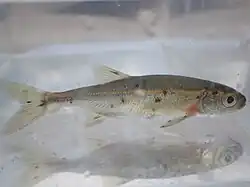 The redside shiner (Richardsonius balteatus) is a species of freshwater ray-finned fish belonging to the family Leuciscidae, the shiners, daces and minnows.[2] This fish is found in the Western United States and British Columbia.[3] This species was first described by Sir John Richardson, a Scottish naturalist and naval surgeon. The type locality is from the Columbia River, and it is believed to have been sampled near Fort Vancouver.[4] This species has a large native range, spanning from southern Utah to northern British Columbia. There are currently two subspecies (R. b. balteatus and R. b. hydrophlox), but phylogeographic analysis based on mitochondrial DNA sequence data suggests that there are three main clades,[5] therefore the two subspecies taxonomy may not accurately reflect the evolution of the group. However, a formal taxonomic update has not been made.