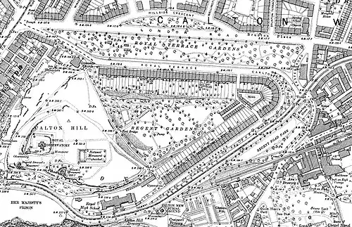 The Regent, Royal and Carlton Terrace Gardens (informally called Regent Gardens, and previously known as the Calton Hill Pleasure Ground and the Large Garden) are private communal gardens in the New Town area of Edinburgh, EH7. They lie over a 4.8-hectare (12-acre) site on the east side of Calton Hill.[1][2] The gardens have been listed on the Inventory of Gardens and Designed Landscapes as part of the New Town gardens heritage designation since March 2001.[1] The gardens form some of the collection of New Town Gardens.