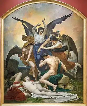 The painting depicts an episode from Greek mythology. Orestes avenges the murder of his father Agamemnon by his mother Clytemnestra and her lover Aegisthus by killing them both.[2] In the moment captured in the painting, Orestes looks down in horror at the bodies of the couple he has just murdered, while around him crowd the Erinyes. By painting both Orestes and Clytemnestra nude, Baader demonstrated his mastery of anatomy to the Academy and appealed to the public at the Salon, who were fond of sensual nudity.[1]
