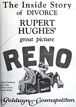 Reno is a 1923 American silent melodrama film produced and distributed by Goldwyn Pictures and was written and directed by Rupert Hughes.[1] Hughes provided his own story to the film which followed Souls for Sale.[2] The film stars Helene Chadwick and Lew Cody.[1]