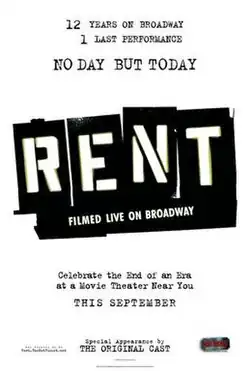 Rent: Filmed Live on Broadway is a 2008 film of the final performance of the original Broadway production of the musical Rent on September 7, 2008, with some footage of the closing night celebration. The film had a limited theatrical release between September 24 and 28, 2008, in more than 500 theaters with high definition digital projection systems in the US and Canada. According to Sony Pictures Releasing President Rory Bruer, it was the first live Broadway show to be available in major North American movie theaters.[1] The film was released on DVD and Blu-ray on February 3, 2009.
