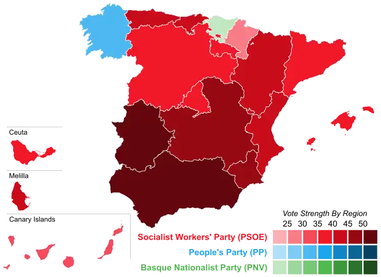 | Region | PSOE | PP | CDS | IU | CiU | RMateos | PA | HB | PNV | EA | UV | EE | ERC | AIC | ||||||||||||||