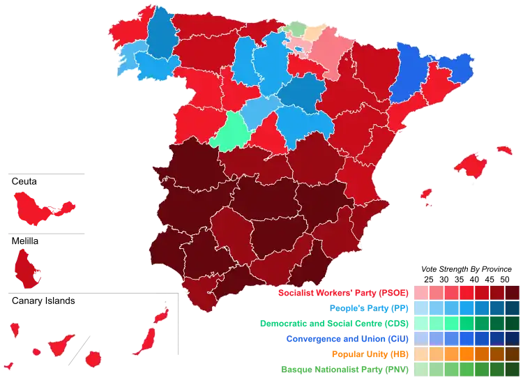 | Constituency | PSOE | PP | CDS | IU | CiU | RMateos | PA | HB | PNV | EA | UV | EE | ERC | AIC | ||||||||||||||