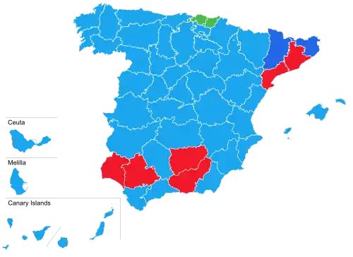 348 members of the Congress of Deputies were elected using the D'Hondt method and a closed list proportional representation, with an electoral threshold of three percent of valid votes—which included blank ballots—being applied in each constituency. Seats were allocated to constituencies, corresponding to the provinces of Spain, with each being allocated an initial minimum of two seats and the remaining 248 being distributed in proportion to their populations. Ceuta and Melilla were allocated the two remaining seats, which were elected using plurality voting.[2][3] The use of the electoral method resulted in an effective threshold based on the district magnitude and the distribution of votes among candidacies.[4]