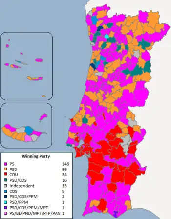 - ^ a b The PSD ran on joint lists with the CDS-PP in more municipalities in 2009, but ran on PSD-only lists in those municipalities in 2013. This number only reflects municipalities where there were PSD/CDS-PP lists in both 2009 and 2013.