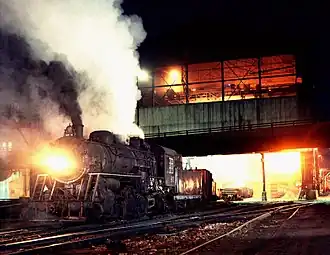 The first diesel-electric locomotives appeared on the Central Railroad of New Jersey in 1925 and on the New York Central in 1927. Moving forward, diesel locomotives began to appear in mainline service in the United States in the mid-1930s.[2] Compared to steam, diesel power reduced maintenance costs dramatically while increasing locomotive availability. On the Chicago, Rock Island and Pacific Railroad, new units delivered over 350,000 miles (560,000 km) a year, compared with about 120,000–150,000 miles (190,000–240,000 km) for a mainline steam locomotive.[3] World War II delayed dieselisation in the US until the late 1940s; in 1949, the Gulf, Mobile and Ohio Railroad became the first large mainline railroad to convert completely to diesel locomotives, and Life Magazine ran an article on 5 December 1949 titled "The GM&O puts all its steam engines to torch, becomes first major US railroad to dieselize 100%".[4] The manufacture of new steam locomotives for stateside use decreased as dieselization continued. The Lima Locomotive Works was perhaps the last commercial builder of steam locomotives, with the final order completed being for ten 2-8-4 “Berkshires” for the New York, Chicago & St. Louis Railroad in 1949. The last steam locomotive manufactured for general service in the United States would follow in 1953: a Norfolk and Western 0-8-0, built in the railroad's Roanoke Shops.[5]