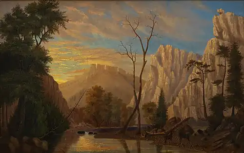 The gift of a paint box several years earlier had given him the desire to become an artist, and he taught himself while performing odd jobs. After a time of wandering, he made friends with the painter, Alfred Lambourne, a fellow Englishman, and they painted scenes for the Lehi Music Hall. Many of his later landscapes would contain imaginary features. A trip back East in 1874, with the intent of taking formal lessons, ended with his money being stolen.[2]