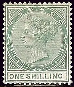 The 1s stamp from Tobago's first revenue issue of 1879.
