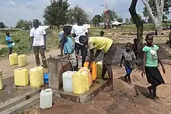 According to the Uganda Refugee Response Monitoring Settlement Fact Sheet: Rhino Camp (January 2018), there are few water sources and difficult-to-pump boreholes contribute to long wait times for refugees to access water. Poor-quality ground water means expensive piped water networks have to be constructed; with the settlement dependent on water provisioning through trucking as construction is ongoing. Additionally, the quality of water from the tanks is poor, with reports of occasional contamination.[20]