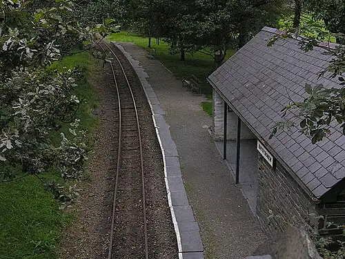 The station building and original platform are primarily constructed out of slate blocks from Bryn-Eglwys quarry.[2] The platform surface is slate chippings and is edged with slate slabs. The 1990s platform extension uses concrete breeze blocks.