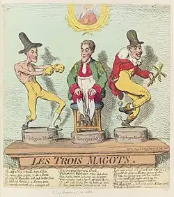 Richard "Hellgate" Barry and his brothers Augustus "Newgate" Barry and Henry "Cripplegate" Barry in a 1791 caricature by James Gillray. The Prince of Wales is portrayed in the background.