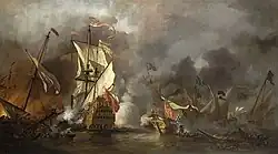In April 1675[b] Carter was appointed captain of the Swan; from which ship he was, on 11 January 1678,[c] removed into the Centurion.[1] He was sent to the Straits in March 1678, under the orders of Sir John Ernley, in the Defiance, as convoy to a fleet of merchant ships. In November 1679 he served on shore, under his old commander, Captain Herbert, in the defence of English Tangier, then severely pressed by the Moors. In this service he was lightly wounded.[3] Centurion was employed in the Mediterranean, more especially against the Barbary corsairs, till she was paid off on 24 October 1681.[5] Carter was appointed lieutenant-governor of Southsea Castle on 26 February 1682.[1]