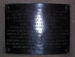 Richard Leveson fell ill while staying in the home of a friend, Hugh Bunnell, next to St. Clement's, Temple Bar, on 22 July 1605.[15] Initially he complained of fever. This was complicated by constant diarrhoea and he died on 2 August 1605. He was buried on 2 September in St Peter's Collegiate Church, Wolverhampton.