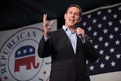 Santorum has been considered a potential presidential candidate in the 2016 election since at least the suspension of his 2012 campaign. A Los Angeles Times article about Santorum's 2012 campaign suspension mentioned that his strong second-place showing in that election would bolster any effort to get the nomination in 2016 or 2020.[3] During an interview with Greta Van Susteren on Fox News on May 6, 2015, Santorum commented that he was the underdog in the 2012 election and that he would likely be the underdog again in the 2016 election, saying "We're very comfortable there."[4] However, eight months in, Santorum failed to get his campaign going, with polling numbers dropping, and staying, below 1.0%.[5] After a poor showing in the Iowa Caucuses, Santorum announced the suspension of his campaign on February 3, 2016,[6] giving his endorsement to Marco Rubio.[7] During an April 25, 2017 question and answer session, however, Santorum commented that Rubio and Cruz would have been inferior to Trump as party nominees.[8]