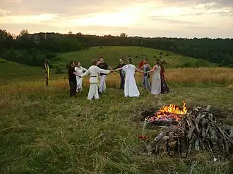 Anastasians engage in communal ceremonies and individual rituals and folk traditions, which are deemed "an obligatory component of a full life",[81] necessary to integrate the "isolated modern man".[82] Rituals for the sacralisation of the "love spaces" are crucial for most believers, a sacralisation which means making the "love space" a place where nature, the thought of God, is ideally free to unfold itself.[83] Various ritual activities are aimed at awakening the "ancestral memory" and the channels of reincarnation; they may include meditation, singing songs and playing musical instruments, composing and reciting poems, and dancing in circle.[82] Rituals of purification, performed in preparation for the holidays and the connection with the ancestors, may include bathing in icy water and then jumping three times over a bonfire, as well as walking on hot coals.[84]
