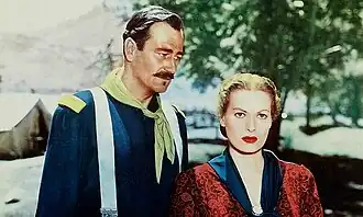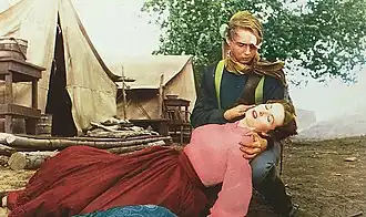 McBride saw Ford's sensitive treatment of Jeff as a possible sign of "self-recrimination over his coldhearted treatment of Pat" (Ford's own son). The ending of the film shows Kathleen performing household chores and waiting with the other wives to show that she is returning to stay with Yorke, which McBride calls "emotionally compelling despite its (qualified) sexism."[16] When Yorke returns, injured on a stretcher, Kathleen publicly walks alongside him, holding his hand, making her decision to stay with him one that includes the entire fort community, where women share in suffering while their husbands fight.[40] While Kathleen's role is limited, she still represents a greater feminine presence than in many other westerns, such as those by Howard Hawks, Anthony Mann, or John Sturges.[41]