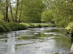 The river then flows through Shepherd Meadows, an SSSI noted for the Black Poplar tree, and a variety of wild flowers, including sneezewort, knapweed, betony, meadowsweet and great burnet.[27] As the river curves to the west, it passes under the North Downs Line railway bridge, flows past Sandhurst sewage treatment works on the right bank and enters Trilakes Country Park. Former gravel pits flank the river on both sides, and as it passes the village of Finchampstead, the channel is briefly called Long Water. Soon it reaches New Mill, where there is a weir and sluice.[16] The mill was a corn mill in 1871[28] and produced animal feed until the 1950s, when the building was sold.[29] The watermill and mill house are grade II listed, with parts of the buildings dating from the 15th century. They were subsequently used as a restaurant, with the restored mill wheel, gears and machinery visible from the seating area, encased behind glass screens.[30] The river follows the northern edge of Bramshill Plantation, 3,200 acres (13 km2) of woodland managed by the Forestry Commission. It is a Special Protection Area in view of the number of bird species to be found there, and also has large populations of damselflies, dragonflies and silver studded blue butterflies. Notable flora includes marsh clubmoss and pillwort.[31]
