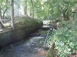 Near Brainshaugh, the river passes over a horseshoe dam, built in 1775 by John Smeaton for John Archbold of Acton and Edward Cook of Brainshaugh. It is built of squared stone, and was repaired and modified in 1926. The downstream face is vertical, and the water falls 8 feet (2.4 m). The curved dam has a radius of 170 feet (51.8 m) and supplied a mill race to the south of the river.[31] This originally powered an iron and tin foundry, subsequently converted to a woollen mill in 1791, and becoming derelict in 1884. From 1915, it was used to manufacture a white pigment called Hydrate of Alumina, and became one of the first factories in the country to be powered by hydroelectric power when a Gilkes water turbine was fitted into the millrace. The factory closed in 1930 when its lease was not renewed following pollution of the river. The mill building was converted into flats in 1968.[32] At the eastern end of the site is Factory Bridge, consisting of three segmental arches, which was built of rock-faced stone in 1865. Some railings were added in the 20th century.[33]