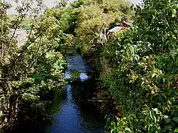 The A633 Barnsley Road crosses at Aldham Bridge, which is followed by another unused railway bridge. Next Stonyford Bridge carries the B6096 road over the river, and Wombwell Ings, an area of low-lying ground and lakes, is located to the south.[3] Wombwell Ings is used as a washland, which is flooded in a controlled way when the river is unable to discharge into the Dearne because of high water levels, which are themselves often the result of high levels in the River Don. They were engineered to act as washlands in 1973, as part of the River Dearne Improvement Scheme.[12] A little further on, the river joins the River Dearne. The total length of this section, including the Blacker Dike, is 7.2 miles (11.6 km) and it has catchment area of 9.73 square miles (25.2 km2).[13][3]