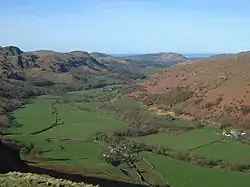 View of Eskdale: the tree-lined Esk enters the bottom right, passing Brotherilkeld Farm and continuing down the valley to the Irish Sea, which can be seen in the far distance.