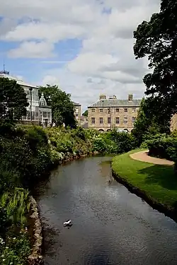 Within the park, the main channel is joined by another source of the Wye, which flows through the public show cave of Poole's Cavern and emerges on the north side of the B5059 Macclesfield Road at Wye Head.[5][6] It enters the park and passes through some large ponds before the junction. Where the river reaches the eastern edge of the park, it enters a culvert.[3] Prior to 1780, the river followed a west-to-east route beneath what is now The Crescent. The 5th Duke of Devonshire employed the architect John Carr to carry out building projects to make Buxton more attractive to visitors. In order the build The Crescent, he diverted the river further to the north, through a culvert, and then built the semi-circular building over the river bed.[7] More of the river was culverted in the 1980s, to allow the Spring Gardens Shopping Centre to be built over it. Two small open sections are still visible before it passes under Bridge Street and a railway embankment to emerge into the open air again, close to the Ashwood Dale play area.[8]