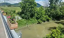 View of the Rivière des Hurons passing under the Chemin de Rouville bridge, in Saint-Jean-Baptiste, Quebec, with Mont Saint-Hilaire in the background