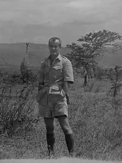 Conley in Kenya with a giraffe in the background