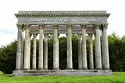 His works for private patrons include the "Temple of Concord" in the grounds of Audley End House, a rectangular Corinthian imitation ruin built for Sir John Griffin in 1790 to celebrate George III's recovery from insanity,[2] and a mausoleum in Scotland for the Fraser family. He also carried out work at Winchester House, St. James's Square, erected originally for the Duke of Leeds; 9 Berkeley Square, afterwards sold to the Marquis of Buckingham; Buckingham House, 91 Pall Mall, rebuilt in 1794 by Sir John Soane; Lansdowne House, Berkeley Square; 80 Piccadilly, for Sir Francis Burdett; Charlton, Wiltshire, for the Earl of Suffolk; Waldershare, Kent, for the Earl of Guilford; Felbrigg Hall, Norfolk, for the Hon. W. Wyndham; Longleat, Wiltshire; and Roehampton, Surrey, and Hillsborough House in Ireland, both for the Marquess of Downshire. Brettingham was held in much regard by his professional brethren, and was the esteemed master of many who later attained eminence in the architectural profession. He died in 1820.[3]