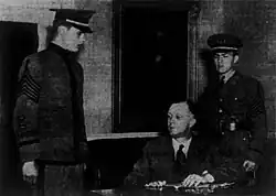 Patterson (left) as first captain of the corps of cadets at John Marshall High School, meeting Governor Colgate Darden in 1943