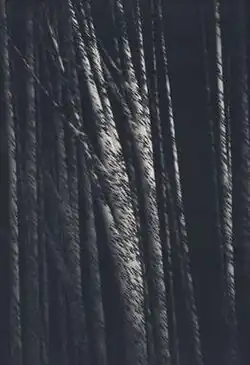 Tall Trees at Night is one of Kipniss's many mezzotints that view trees fairly close up at dusk or night and show a play of light upon them. The characteristics that became increasingly prominent in his mature work, his concern with capturing the essence of form and with even more subtle light effects, are clearly apparent. The trees in Kipniss's mezzotints have an especially strong purity of form when only their trunks are depicted. Sometimes leaves are spread across the trees, adding more movement and increasing the technical challenge.[41]