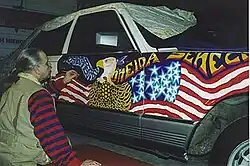 Hieronimus painting in the Hebrew lettering in the banner held by the eagle on his “Founding Fathers” art car.