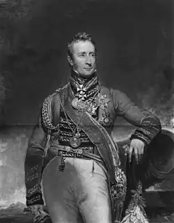 He had a distinguished career in the Army and the diplomatic service. In 1794, as an ensign in the 15th Light Dragoons, Wilson fought in the celebrated Battle of Villers-en-Cauchies where a handful of cavalry smashed a much larger French force. He was made a Knight Bachelor in 1801.[1] That year also saw him serving in Egypt under General Abercromby and later General Hely-Hutchinson as the French were driven out of Cairo and Alexandria. In 1804 he became a lieutenant-colonel in the 19th Light Dragoons. In 1805 as Lieutenant-Colonel of 200 from the 20th Light Dragoons he joined the forces for the invasion of the Cape of Good Hope, in January 1806. In 1806 he joined a diplomatic mission to Prussia led by Hutchinson, with whom he had served in Egypt. Wilson was present at the battle of Eylau and Friedland. He was briefly at Tilsit at the signing of the Treaty of Tilsit and claimed to have crossed to the French side of the river while disguised as a Cossack in the company of a friend who was also a Cossack general.[2] After the treaty was signed he travelled to St Petersburg and unaware of the secret clauses, campaigned vigorously for continued friendship between Britain and Russia. When the British ambassador discovered that Russia was about to declare war, Wilson was despatched to Britain with the news. It was hoped that he could overhaul a Russian courier who had been sent ahead of him, which he did in Stockholm. Having left St Peterburg on the eighth of November, he arrived in Scarborough Yorkshire, England on the thirtieth.[2] By four AM on the second of December he was waking up the British Foreign Secretary, George Canning, with the news. The early warning enabled Britain to detain a Russian warship then in its waters and unaware of the impending war declaration.[3]
