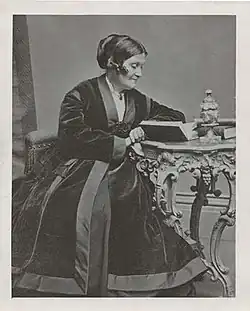 Bush later said, "at the close of the first session Lucretia Mott came forward, folded me tenderly in her arms and thanked me for presiding... When I found that my labors were finished, my strength seemed to leave me and I cried like a baby. But that ended the feeling with women that they must have a man to preside at their meetings."[9] Four years later, Mott herself presided at the Third National Women's Rights Convention in Syracuse.[10] Stanton afterwards apologized for her "foolish conduct" at the Rochester convention in a letter to Amy Post, saying, "My only excuse is that woman has been so little accustomed to act in a public capacity that she does not always know what is due to those around her."[11]