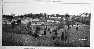 Meanwhile, the Land Company was creating an extension of Connecticut Avenue northward from the Rock Creek valley past the D.C.-Maryland line and into the land that would become Chevy Chase, Maryland. The railroad would run up the center of the new road, which was graded 150 feet wide.[5]