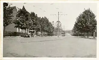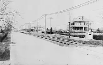 The line ended just south of the grade crossing of the Baltimore and Ohio Railroad's Georgetown Branch at Connecticut Avenue. Here the Rock Creek built a terminus complex that included a small station and the railroad's six-track car barn. Coquelin Run, a small tributary of Rock Creek, was dammed to create a lake to supply water to the railroad's northern power house.[10] This generating plant, which burned coal that arrived on a B&O siding, used the Thomson-Houston system installed by General Electric to deliver electricity to streetcars via overhead poles. The poles—ornamented iron within the city and a mile beyond, square post lumber for the remaining mile—drove streetcars all the way to 18th and U Streets.[1][11][12]