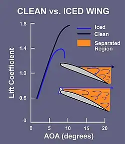 A diagram showing the relationship between the angle of attack and lift coefficient on a clean wing and an iced wing
