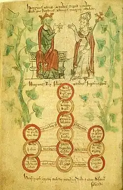Roger got drawn into the controversy with Becket because Henry II wanted to have his eldest living son crowned as king during Henry's lifetime.(Traditionally, the ceremony is performed by the Archbishop of Canterbury) This was a new practice for England, but was a custom of the Capetian kings of France, which Henry decided to imitate.[14] Henry II insisted that his son, Henry, be crowned at Westminster Abbey on 14 June 1170 by Archbishop Roger of York.[9] Also present at the coronation were the bishops of London, Salisbury, Exeter, Chester, Rochester, St Aspah, Llandaff, Durham, Bayeux, Évreux and Sées. The only English bishops absent seem to have been Winchester, Norwich, Worcester, and, of course, Thomas Becket, Archbishop of Canterbury, who was in exile. The remaining English sees were vacant.[15] This overstepped a long tradition which reserved coronations to the Archbishop of Canterbury, a reservation confirmed as recently as 1166 by Pope Alexander III. In 1170, however, Henry II received papal permission to have Roger crown the younger Henry, a permission which Alexander later revoked.[16][17]
