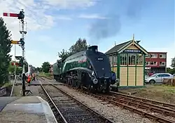 Until 2019 there were no steam locomotives based on the line, with the Mid-Norfolk hiring steam locomotives based on other railways for use during the Summer season and most remaining services utilising diesel traction. Sentinel 4wVBT 9596 "George"[9][10] and Robert Stephenson & Hawthorns 0-4-0ST 7818 "Castle Donington Power Station No. 2"[11] are stored in the former yard at Yaxham, independently of the MNR. Great Western Railway 0-6-0 PT '9466' was a regular visitor to the line, but wasn't based at Dereham.
